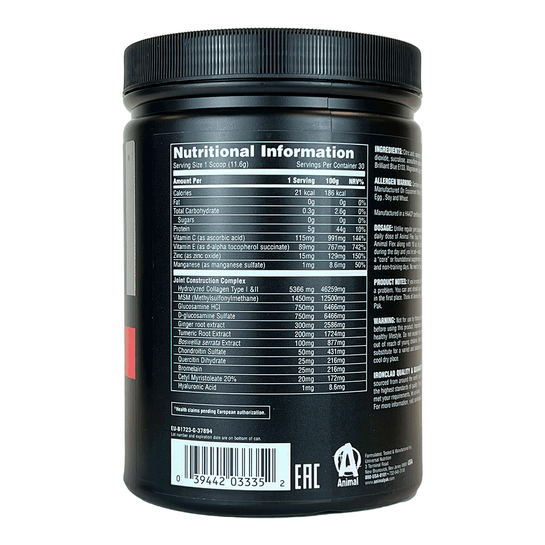 Animal Flex helpt botten, gewrichten en ligamenten te versterken en te beschermen tegen de dagelijkse slijtage door rigoureus trainen, ongeacht op welk niveau je sport. De ingrediënten in Animal Flex Powder kunnen helpen bij het behouden van gezonde gewrichtsfunctie, elasticiteit en flexibiliteit(*/**/***) met actieve ingrediënten die de basisbouwstenen bieden die nodig zijn om de structurele integriteit van het menselijk lichaam te behouden om de basis van uw lichaam sterk te houden.
